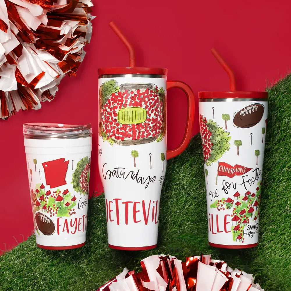 Mega sips, mega chill! 🧊 Hydrating has never been easier with our 40oz Insulated Mega Mug! A cup holder-friendly frame, a comfort-grip handle, and a plastic straw with a silicone flexi-tip all come together to create your new favorite Swig. Saturdays are for Football and Tailgates! These one of a kind designs by Rachel Walker display what makes your college town so special on a Saturday! - Holds up to 40oz - Keeps drinks cold 24+ hours and hot 9+ hours - Comfort-grip plastic handle - Fits most standard cup holders - Double-walled, vacuum-sealed, and copper-plated - Condensation-free and non-breakable - Constructed of 304-18/8 stainless steel - Built-in silicone coaster base prevents slips, drips, and scratches - Includes an X-Large Lid with flexible silicone gasket - Includes a Mega Mug plastic straw with a removable silicone flexi-tip - Dimensions: 9.9” H x 5.9” W (lid included); Base: 2.8” diameter; Straw: 12" L; Weighs: 1.2lb when empty