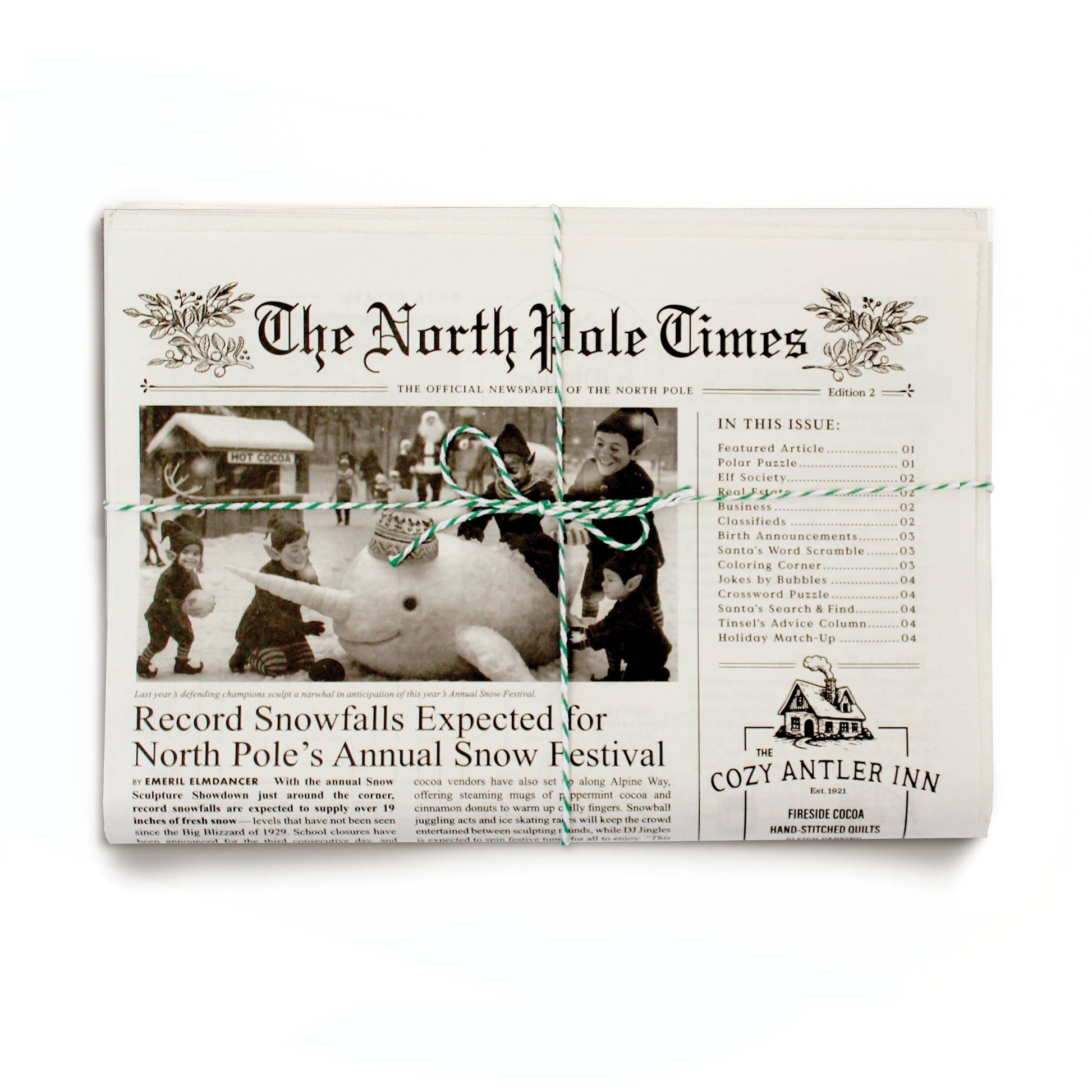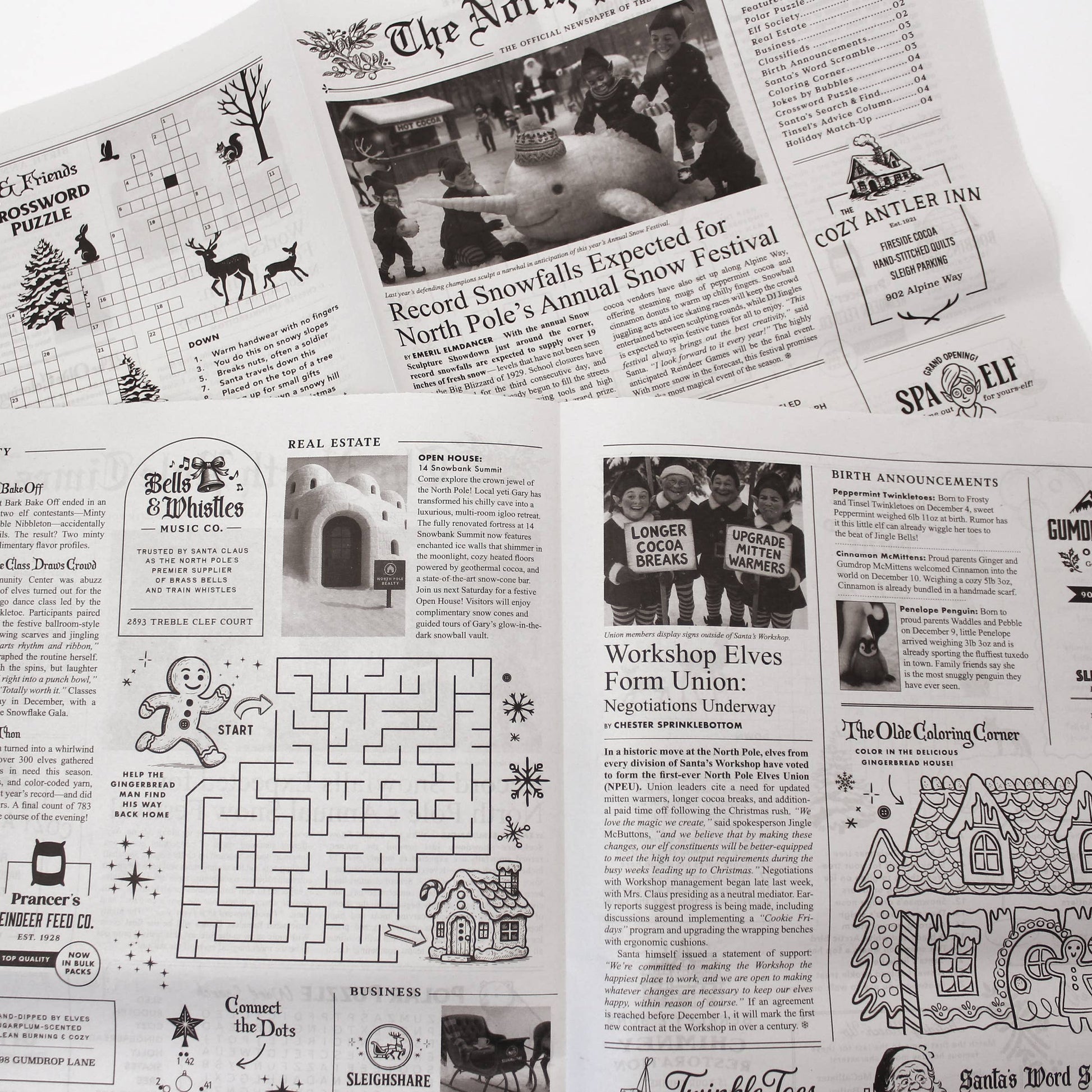 Our new edition for 2025 is here! This adorable novelty newspaper doubles as a Christmas activity, and is sure to become a holiday tradition for your customers. The North Pole Times is filled with fictional articles, activities, ads and more to explore! Package includes four full double-sided sheets on real newsprint. Use them for wrapping gifts, a holiday activity, stocking-stuffers, a Christmas Elf activity, or something that Santa leaves behind on Christmas Eve! The North Pole Times can also be used for Christmas décor on the mantel!