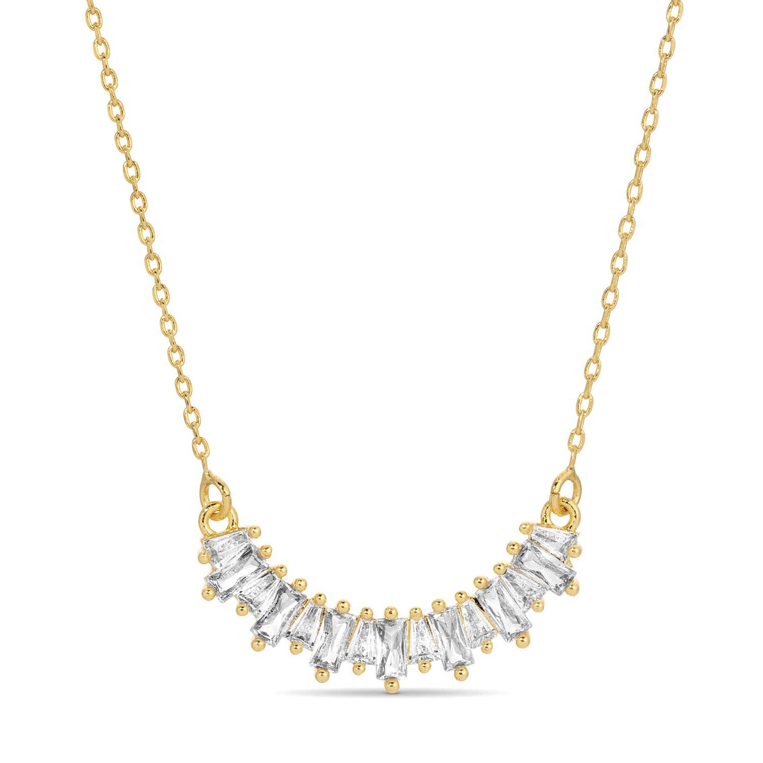 Elevate your style with this refined Baguette Curve Pendant Necklace, designed to impart a subtle elegance. The pendant measures 1 inch wide by 0.5 inches high and hangs from a 16-inch chain. Crafted from 18K gold plated brass and accented with cubic zirconia, this piece offers a sophisticated finish to any ensemble.