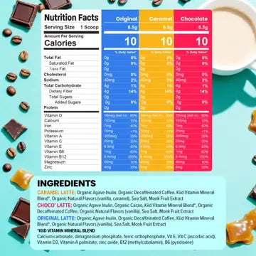 Yes, the world's first coffee for kids. Available in three delicious flavors: Original Latte, Choco' Latte, Caramel Latte. * Delicious Organic Decaf Coffee + Cacao with more antioxidants than most fruits and vegetables. * 99.9% Caffeine-Free via water-process decaffeination. Kiid Coffee has less caffeine than 1 ounce of chocolate, without any nasty chemicals. * Zero Sugar – Lightly sweetened with Organic Monk Fruit Extract * Real Nutrition - 4g Prebiotic Fiber per serving, +12 Essential Vitamins & Minerals, including calcium, magnesium, iron, and vitamin D3. * No Junk Ingredients or bogus health claims – We're all about real nutrition, unlike most food and 'multivitamin' brands (but don't believe us, just check the label) * 100% Vegan - NO Dairy, Soy, Gluten, or GMO's (organic ingredients are always non-GMO)!