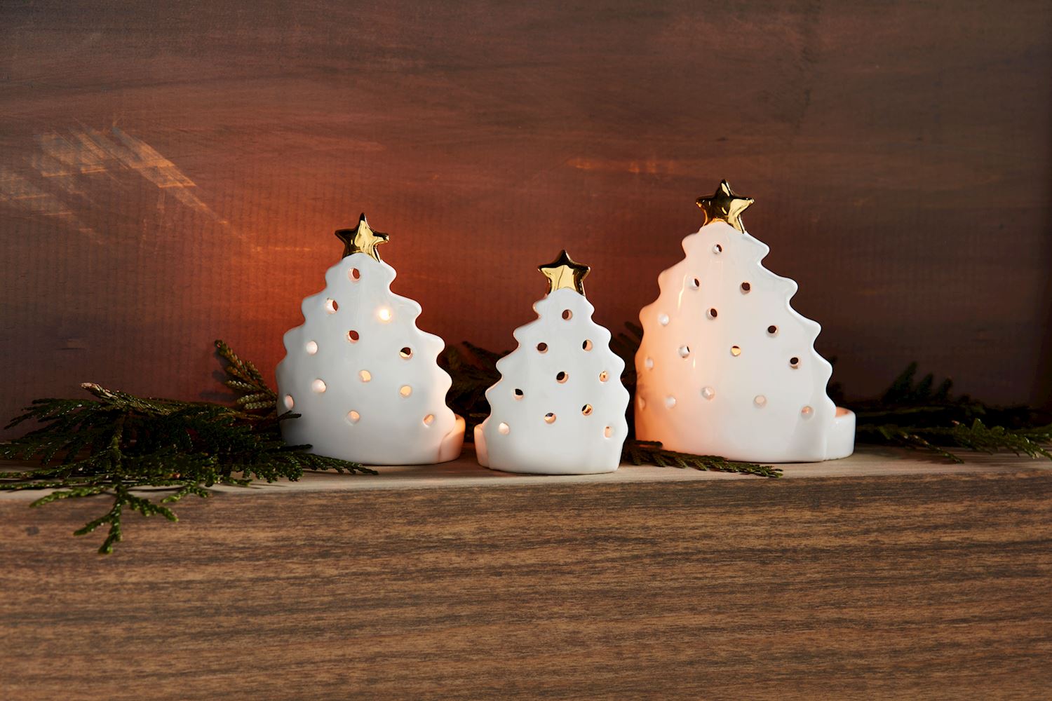 This elegant set features three nesting pierced stoneware votives shaped like Christmas trees, each designed to hold a tea light securely on its included plate. The intricate perforations create a graceful glow when lit, while electroplated stars crown each tree, adding refined seasonal detail. Crafted for both aesthetics and functionality, this votive set enhances holiday decor with warm, inviting light and timeless craftsmanship.