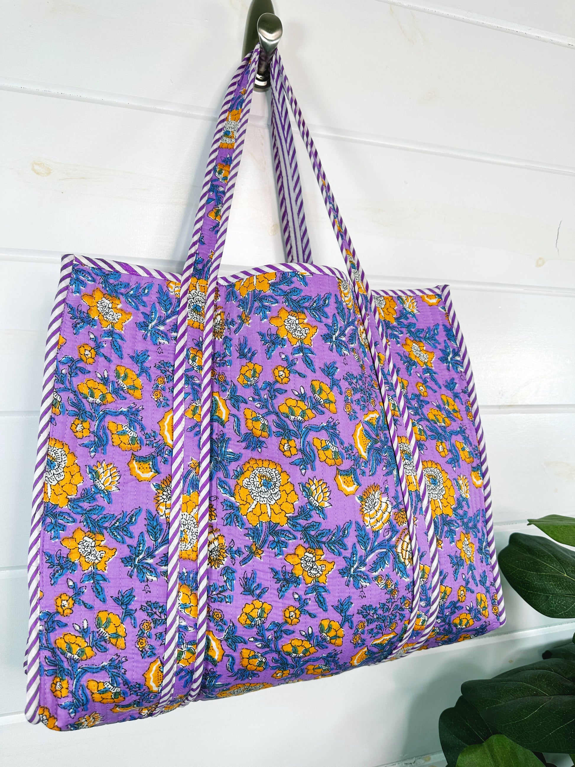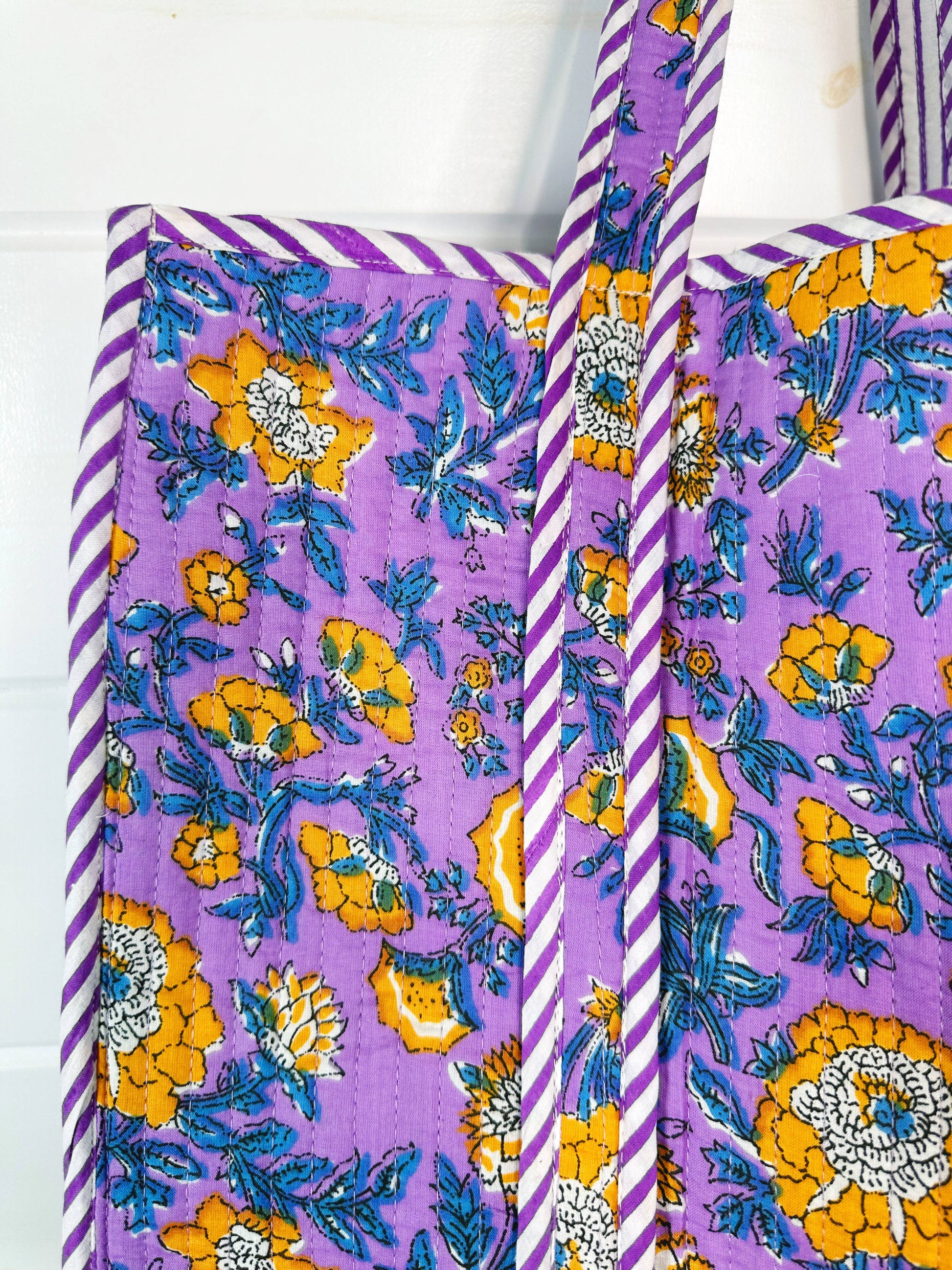 This versatile quilted tote showcases a striking purple and yellow floral design on durable 100% cotton fabric. The reversible construction offers two distinct looks in one bag, while an interior pocket adds practical storage. Measuring 17.5" x 17.5", it accommodates everything from weekly groceries to weekend getaways. Handcrafted by Indian artisans using traditional block-printing techniques, each piece reflects sustainable, artisanal quality. The limited production run and hand-finished details mean subtle variations enhance rather than diminish its character. Ideal for market shopping, beach trips, travel, or as a thoughtful gift for those who value craftsmanship and eco-conscious design.