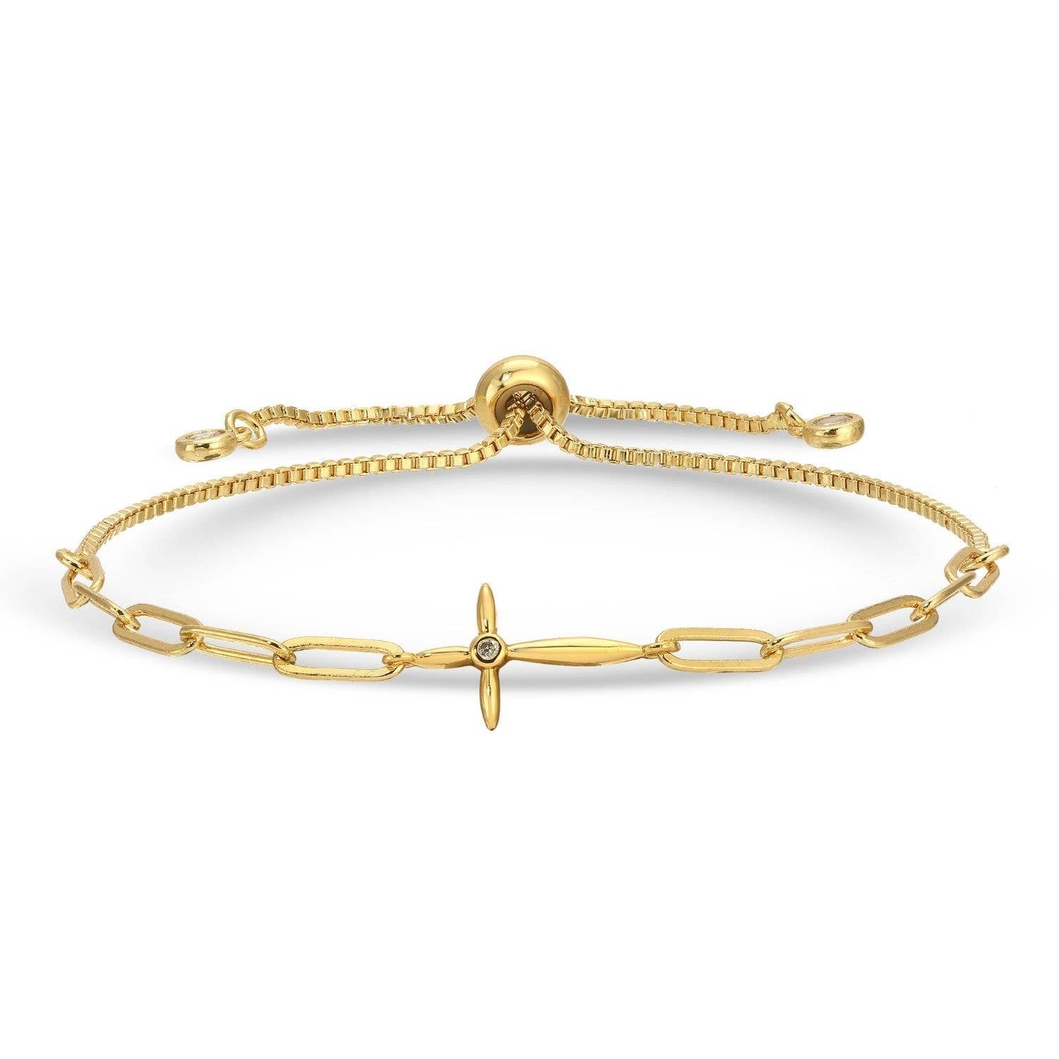 Embrace faith and elegance with our beautiful Delicate Cross Pulley Bracelet. This exquisite piece features a slender, graceful cross design, subtly enhanced by a sparkling cubic zirconia accent at its center. Crafted with an 18k gold-plated brass base, it offers the luxurious gleam of solid gold while maintaining a lightweight feel. The innovative adjustable pulley closure ensures a perfect, comfortable fit for any wrist size, making it ideal for everyday wear or a thoughtful gift. This bracelet is a perfect blend of meaningful symbolism and modern style, adding a touch of serene sparkle to any outfit.