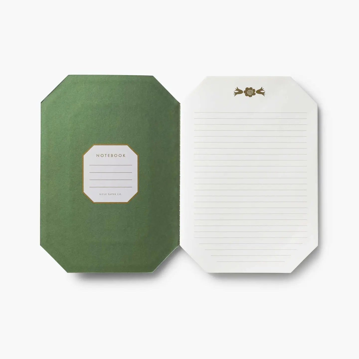 These lay-flat notebooks features stitched binding, gold foil accents, and 64 ruled pages each. A delightful die-cut notebook features our Gemma pattern in three complementary colorways. Assorted