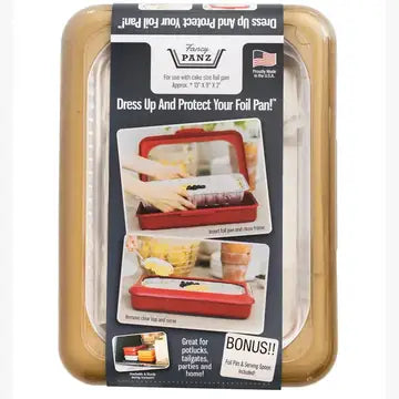 WHAT IS A FANCY PANZ®: Fancy Panz are used to dress up, protect and serve from a foil pan. Perfect for tailgating, potlucks, outdoor dining, picnics, home and more! WHAT'S INCLUDED: 1 removable clear top 1 9x13 foil pan 1 reusable serving spoon EASY TO USE: Open the frame, place your filled foil pan inside, and snap on the clear lid. Works with hot or cold food, straight from the oven or fridge. TWO WAYS TO SERVE: Use the clear lid as a trivet or keep it on to maintain food temperature and keep bugs out. EASY CLEANUP: Remove the foil pan and take your Fancy Panz home—leave the leftovers behind. IDEAL FOR TRAVEL: Stackable and sturdy, Fancy Panz prevent spills during transport. *All Fancy Panz are BPA-free, dishwasher safe, and proudly made in the USA!