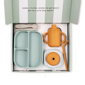 Ready, set, eat! Introducing our expert-approved toolkit of mealtime essentials for baby’s first food and drink! This set is the perfect new baby gift and a parent must-have. Each set includes all of the products needed for the first moment of introducing solids to little ones. Each product is designed to be used from parent led weaning or baby led weaning to independent eating. One set includes everything you need: 1 cup, 2 lids, 3 utensils, 1 suction plate, and 1 starter bowl in a ready-to-gift box