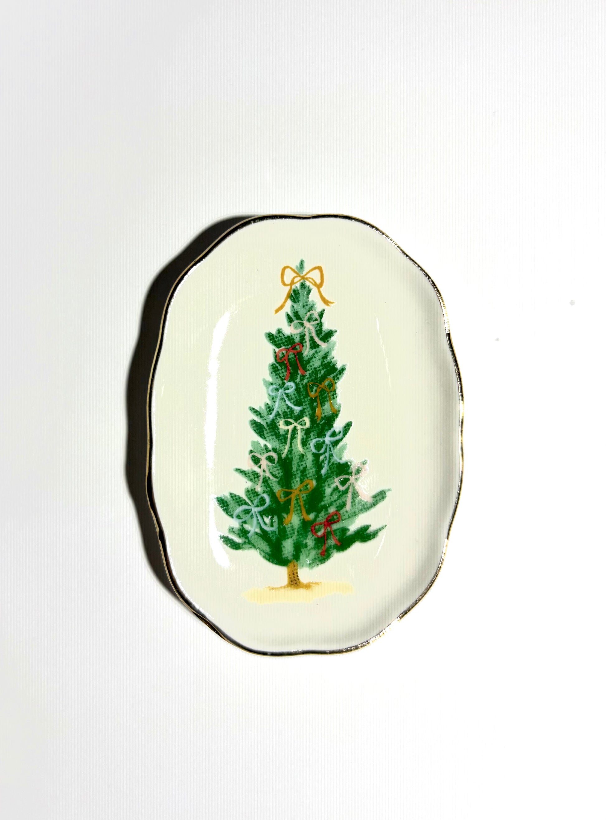 Crafted from durable stoneware with an elegant scalloped edge, this 3" by 2" dish features festive holiday imagery enhanced by sophisticated gold electroplating. The multi-color design brings seasonal charm to any space, making it ideal for displaying small treasures, serving delicate treats, or adding a refined touch to your holiday décor.