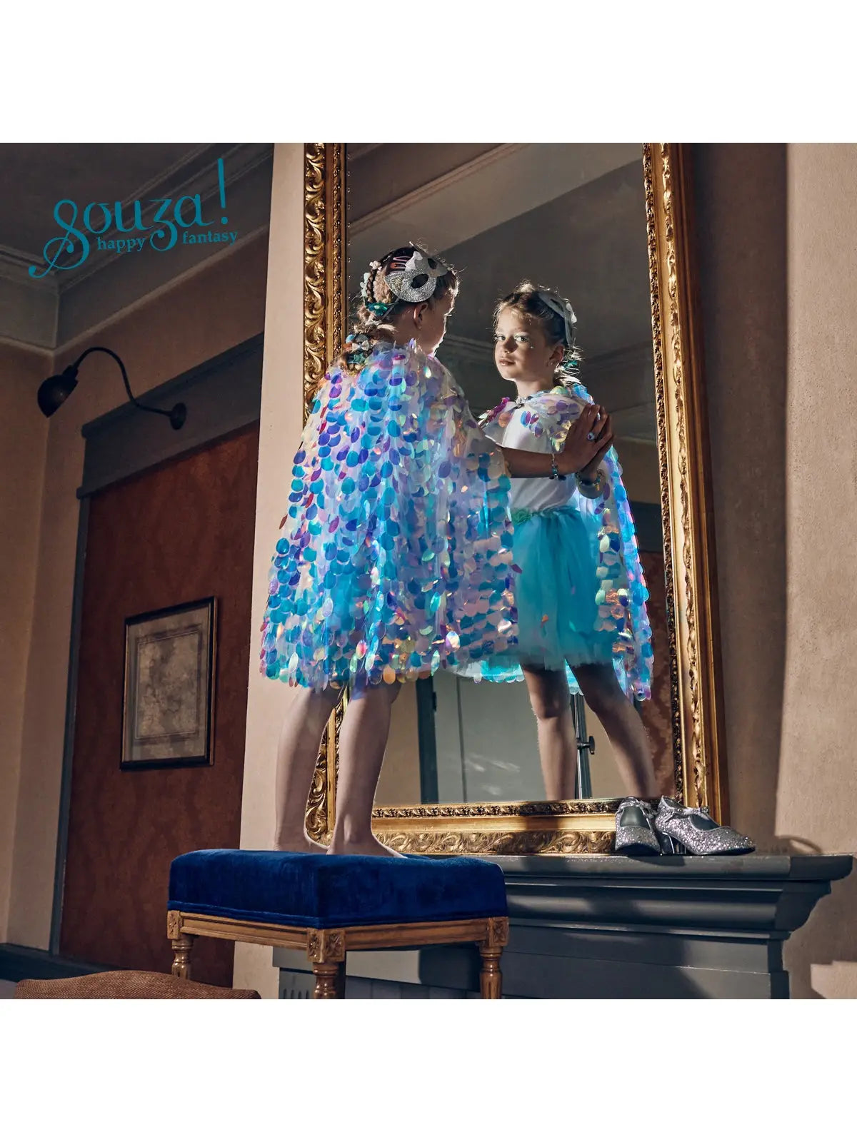 This enchanting cape brings magical moments to life with its mesmerizing color-shifting design. Constructed from delicate polyester tulle embellished with teardrop sequins that dance between blue and pink tones, the Lorelie Cape reflects light with every twirl and movement. The secure clasp fastening and graceful drape create an easy-to-wear silhouette that young adventurers can enjoy throughout the day without restriction. Weighing virtually nothing, this cape supports extended imaginative play without fatigue. Offered in two proportional sizes—22.83 inches for ages 3-4 and 27.16 inches for ages 5-7—ensuring the perfect fit for growing children.