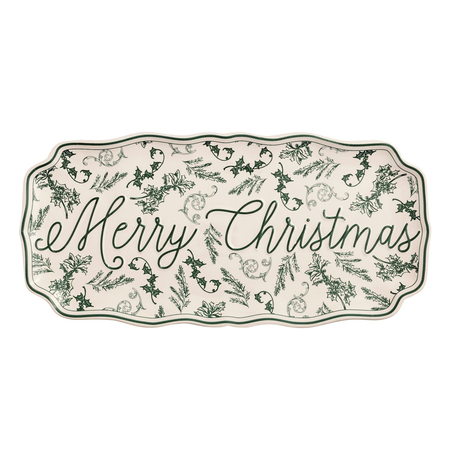 This stoneware toile tray features a meticulously hand-painted rim detail, showcasing expert craftsmanship. Its durable material makes it perfect for serving or as an elegant decorative piece, combining functionality with refined artistry. Ideal for those who appreciate handcrafted quality in everyday items.