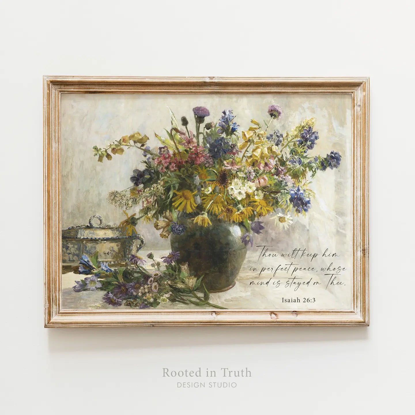 featuring moody, neutral tones. Paired with Isaiah 26:3 reminding of us of God's deep abiding peace that keeps us when our eyes are on Jesus. Compliments modern farmhouse, french, cottage, rustic, country, boho decor. Perfect Christian or nature lover gift. (Frame Not Included)