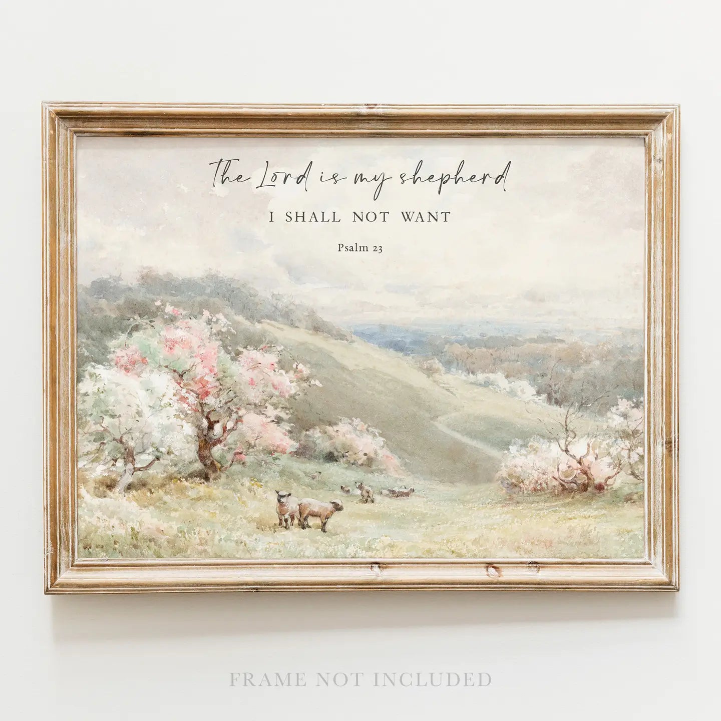 The Lord is my Shepherd wall art print features a vintage 1800's country landscape painting. Paired with the simple Psalm 23 reminder of the faithfulness of our Good Shepherd Jesus Christ. Compliments modern farmhouse, french, cottage, rustic, country, boho decor. Perfect Christian or nature lover gift. (Frame Not Included)