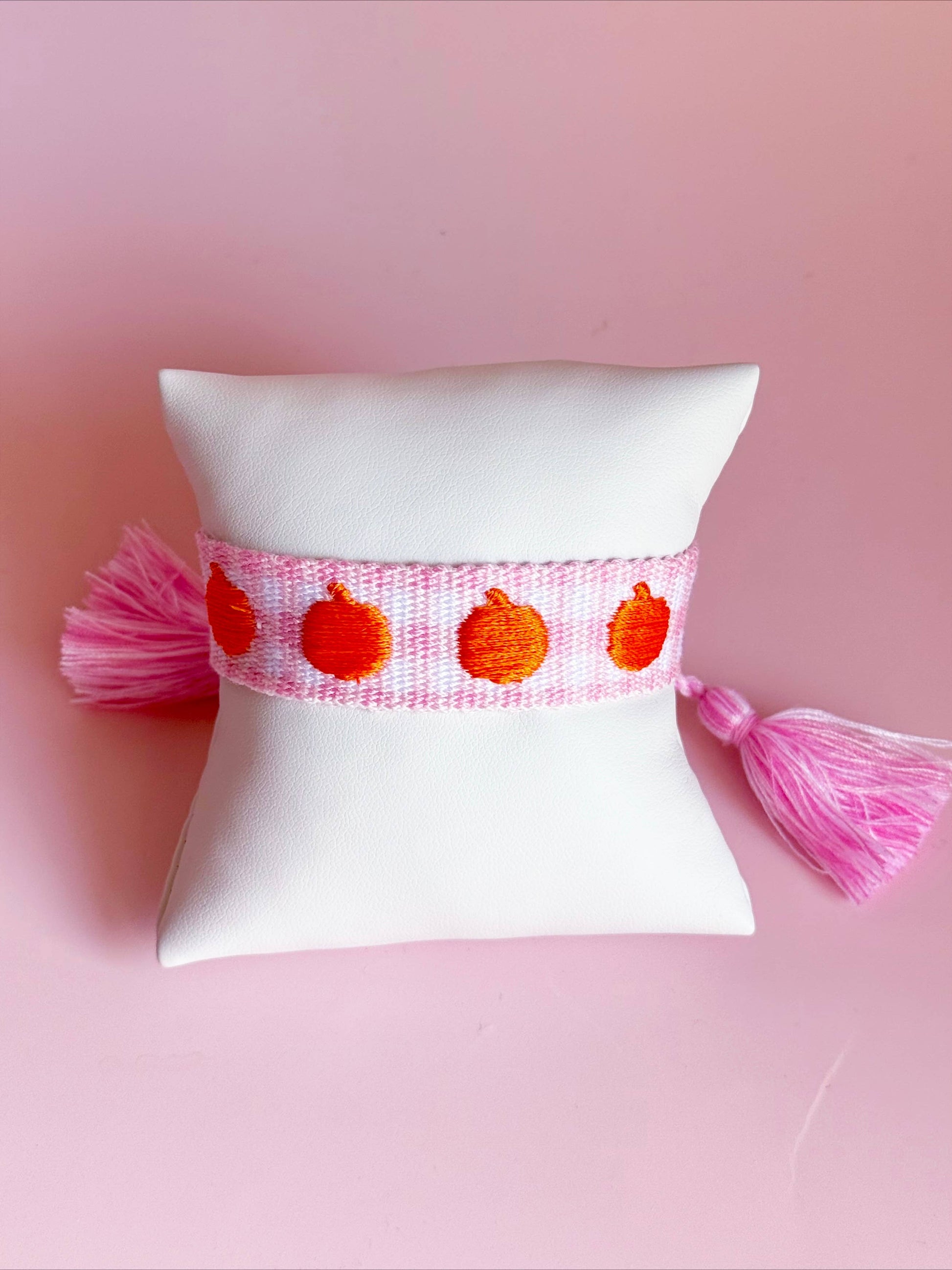 Pink and white gingham woven, adjustable bracelet with orange pumpkins. Perfect for Halloween and Fall!
