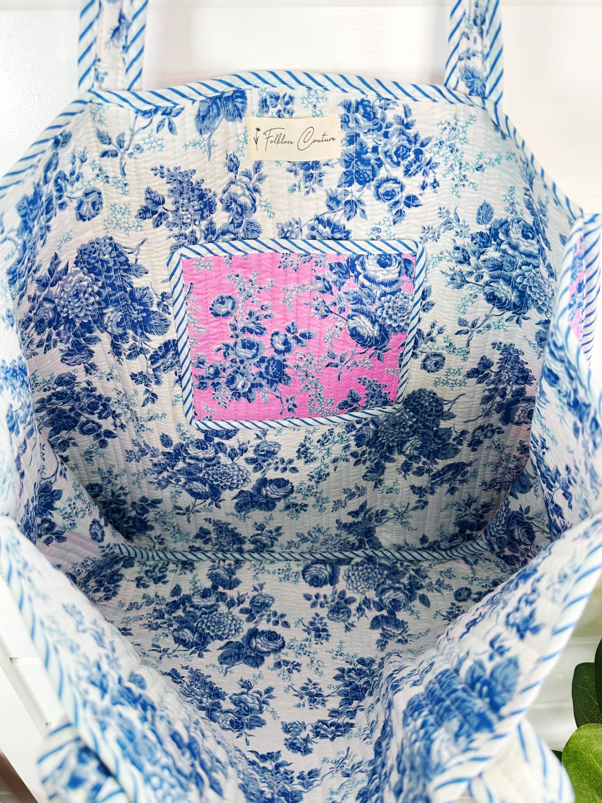 This reversible quilted tote seamlessly transitions from farmers market to beach getaway. Crafted from 100% cotton with handprinted block patterns, it features a contrasting interior and functional pocket, measuring a generous 17.5" x 17.5". Each bag is meticulously created by Indian artisans using sustainable practices, with limited-edition prints that ensure uniqueness. The quilted construction provides durability while the dual-sided design maximizes versatility. Ideal for discerning shoppers seeking quality craftsmanship, this piece works equally well as a practical everyday carry or a thoughtful gift. Handmade in small batches by Folklore Couture in Missouri, expect shipment within 1-3 business days. Natural variations in the block print add to each bag's individual character.