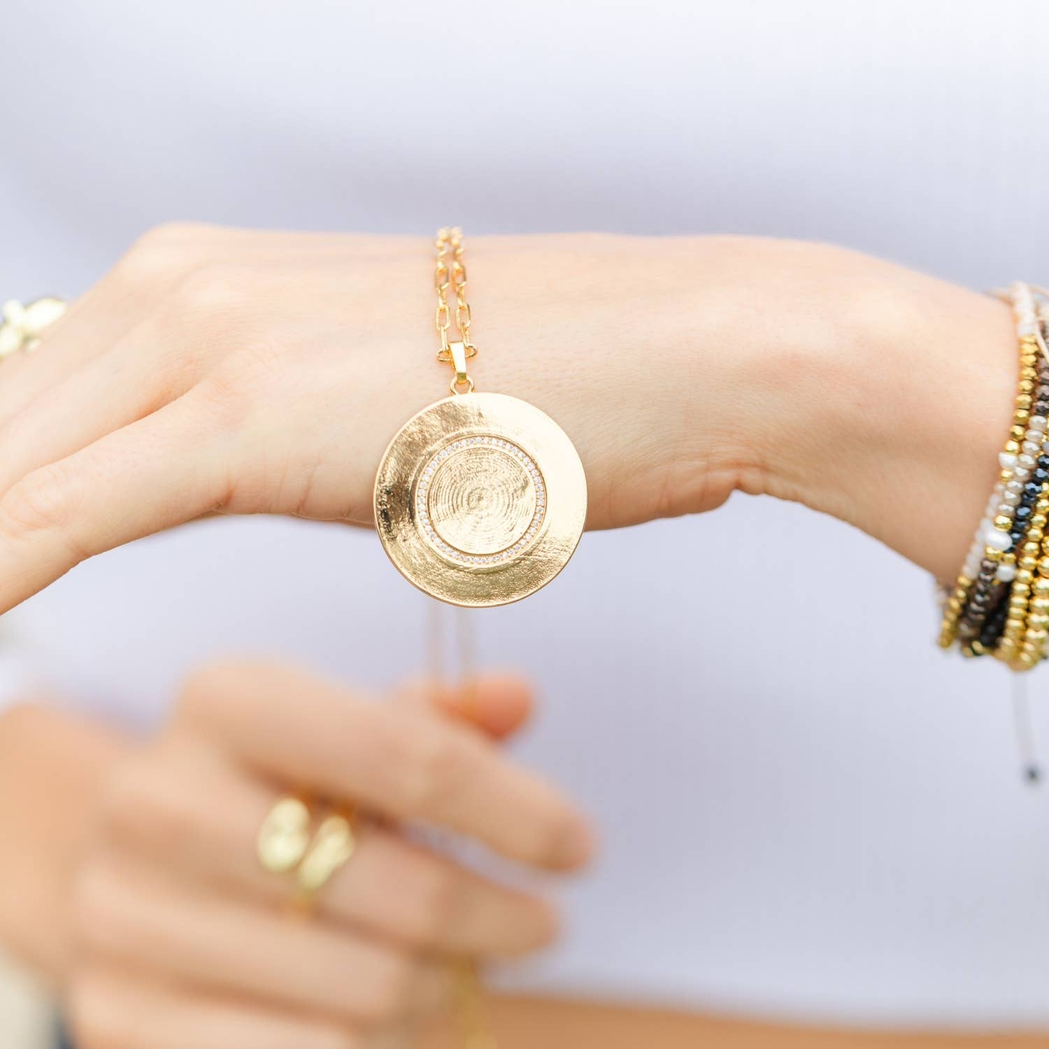 This pendant features a large textured disc with a delicate pave circle, hanging from a 24" paperclip chain. Made of 24k gold or rhodium-plated brass, it includes sparkling cubic zirconia accents.