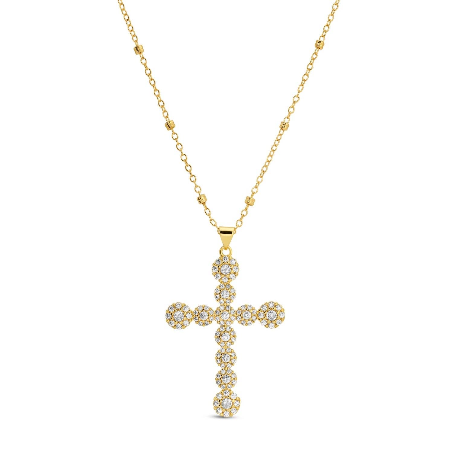 This 30" long necklace features a prominent vintage-style cross pendant measuring 1.2" by 1.7". Crafted from brass with an 18k gold plating, the pendant is adorned with cubic zirconia stones for a refined, classic look.