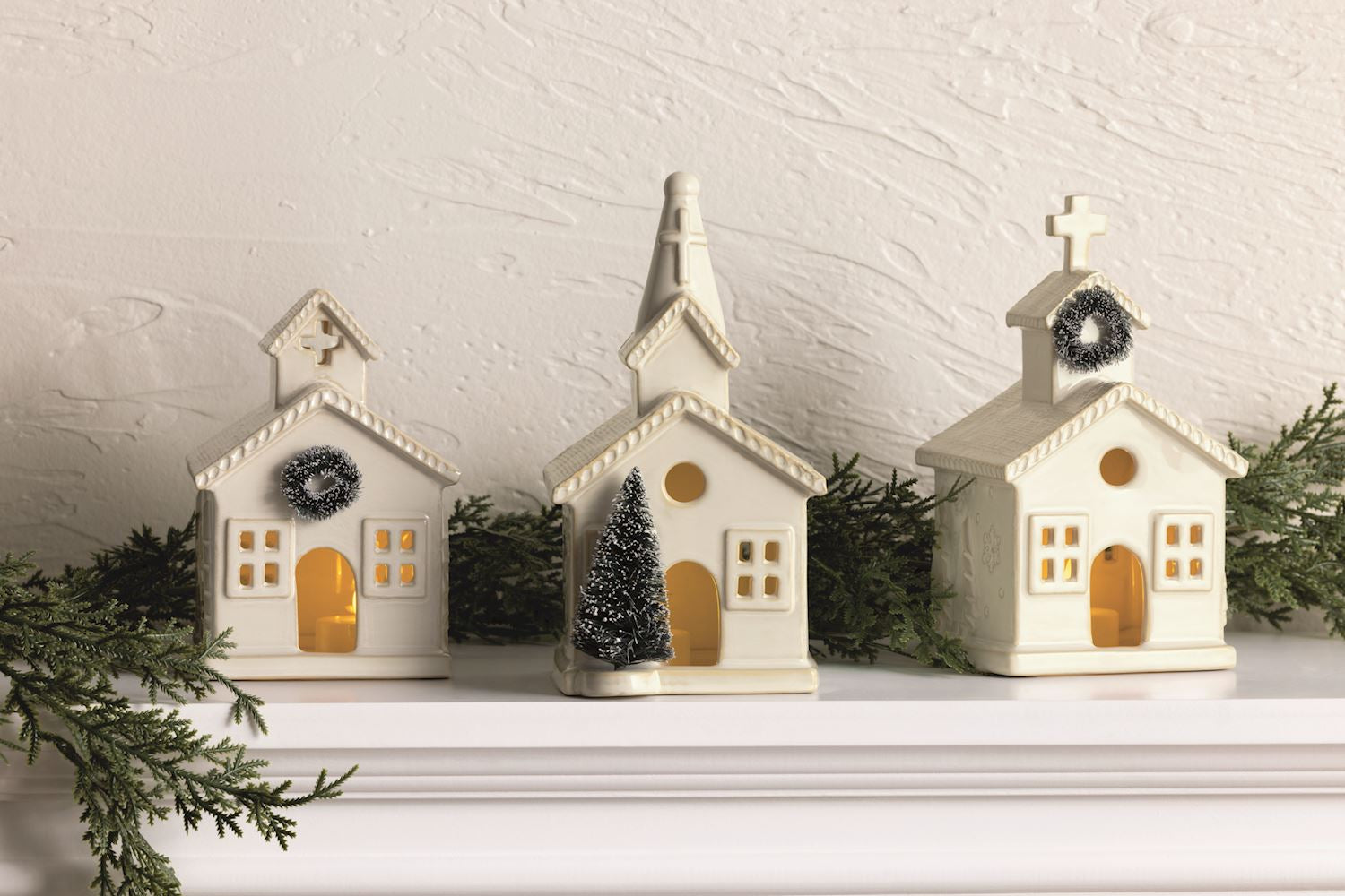 This ceramic church sitter is crafted from milk-glazed stoneware, showcasing delicate bottle brush wreath or tree details. Its pierced openings allow light to gently shine through, creating a warm, inviting glow. Designed to be placed over a flameless tea light, it adds subtle illumination and charm to any space, perfect for seasonal décor or year-round ambiance.