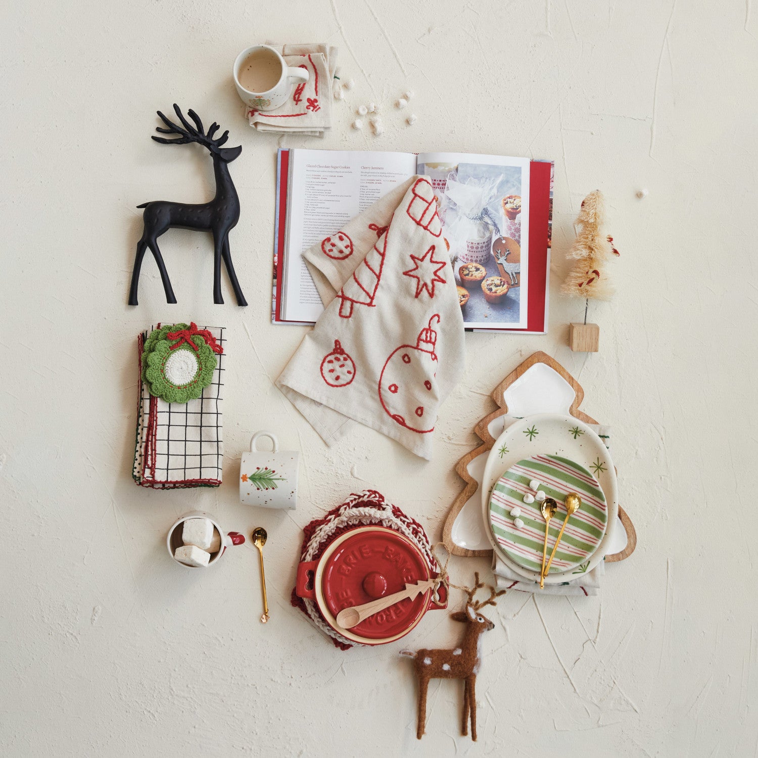 This stoneware brie baker with a wood tree-shaped spoon is a beautiful and festive piece that will make cheese lovers happy. The brie baker features a red color that adds some warmth and cheer to any table. The brie baker also features a reactive glaze that gives it a unique and glossy finish. The brie baker is made of sturdy and durable stoneware, and each one will vary slightly. It comes with a matching lid and a wood spoon that has a cute tree shape at the end. The brie baker is ideal for baking and serving cheese, dips, or appetizers in style. The brie baker is oven-safe, microwave-safe, and dishwasher-safe for easy use and cleaning. The brie baker measures 9 inches in length, 7 inches in width, and 3 inches in height. This piece is a great way to wow or indulge anyone. A beautiful and festive stoneware brie baker with a wood tree shaped spoon, a reactive glaze, and a red color. Perfect for baking and serving cheese, dips, or appetizers in style. The brie baker comes with a matching lid and a wood spoon that has a cute tree shape at the end.