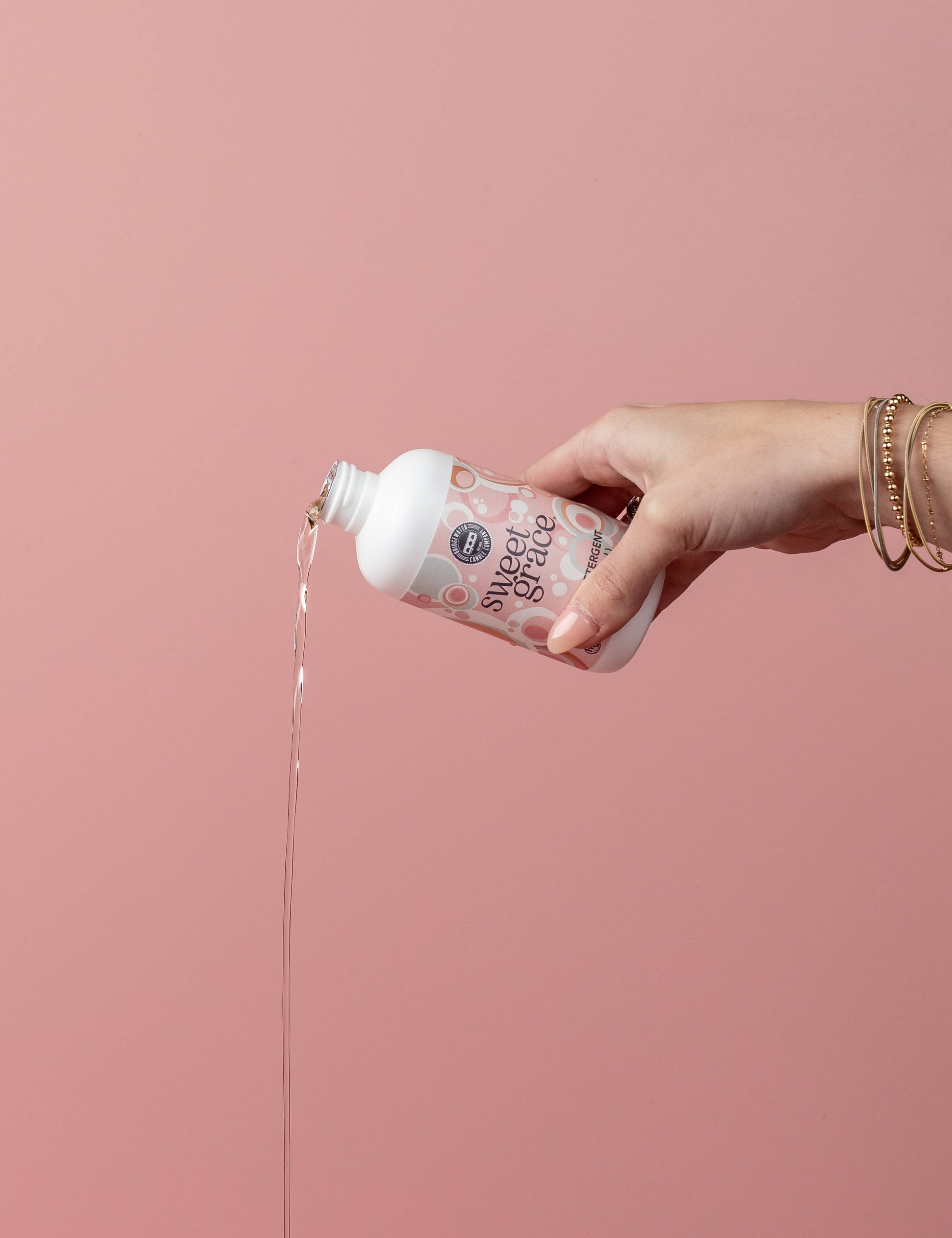 Our 6 oz Sweet Grace Laundry Detergent gently cleans and sanitizes washable fabrics while leaving a lasting, warm fragrance. Its unique scent blends passionfruit, apricot, tea, vanilla, caramel, chocolate, and patchouli for a comforting and elegant finish on your clothes and linens.