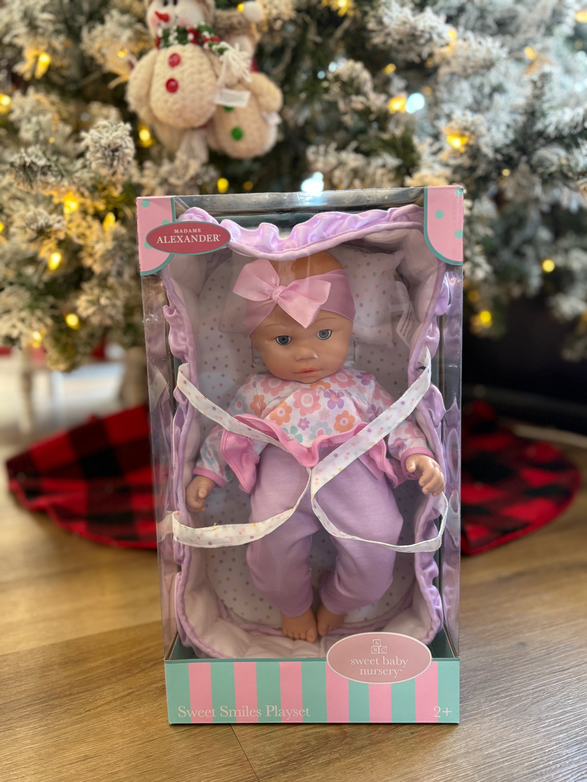 Our Sweet Smiles family is expanding with 4 new realistic 14-inch dolls. Snack Time baby comes with a highchair and bib for feeding fun. Puppet Play includes puppet friends for hours of imaginative play. Bear Sleep Sack features a cozy, bear ear adorned swaddle and sleep mask. Slumber Carrier baby comes tucked in her own Moses basket with handles for on the go play. Let the nurturing fun begin! Catch some zzz's with this 16-inch Slumber Carrier Sweet Smiles doll. This cutie comes with her own quilted, comfy bassinet with handles. Dressed in a floral dress and bow headband. The baby has a soft body, a weighted bottom and molded head, legs, and arms so it feels so real to your child! The baby’s gently smiling face has sleepy eyes, facilitating bedtime play. Ages 12 mo+.