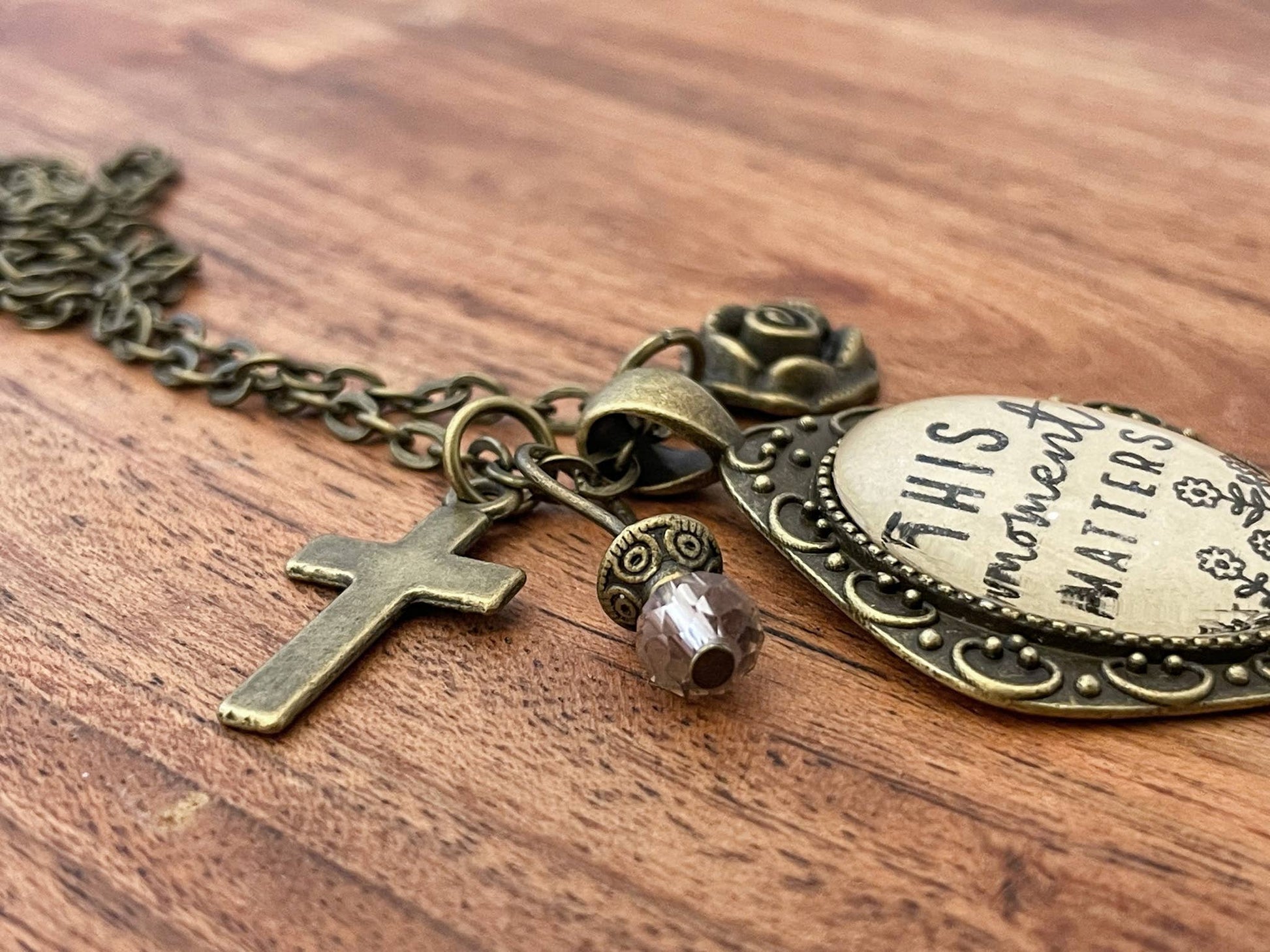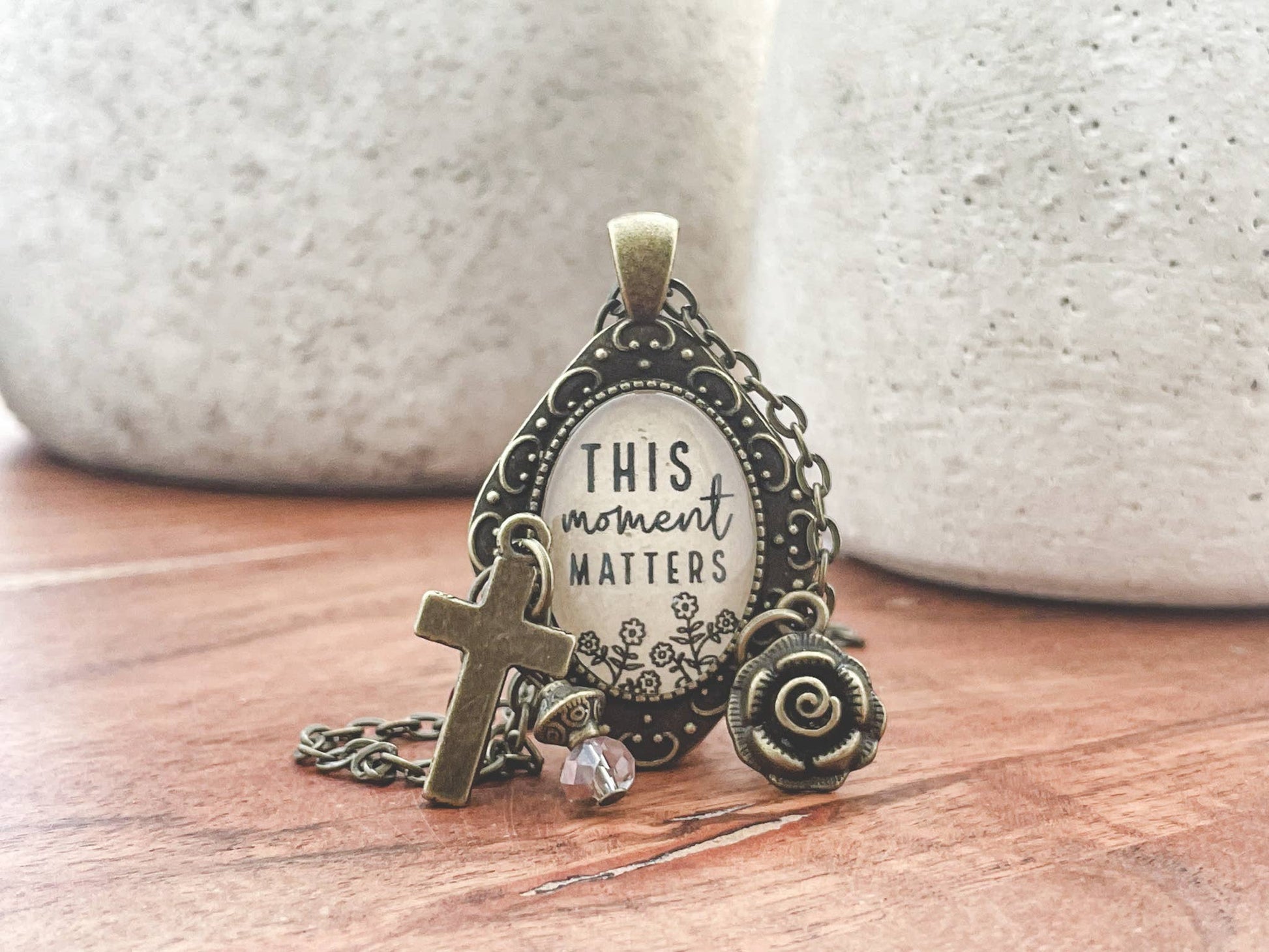 Pendant Dimension - approximately 7/8 inch x 1 1/4inch Vintage inspired, inspirational pendant. We make a variety of Religious themed jewelry to encourage and inspire your people. "This moment matters" pendant with cross and rose charm. Beautiful, handmade necklace comes already packaged and ready for display. *All designs are printed on our hand-dyed paper. Expect variations in the paper background. *All pendants come on a 24 inch chain.