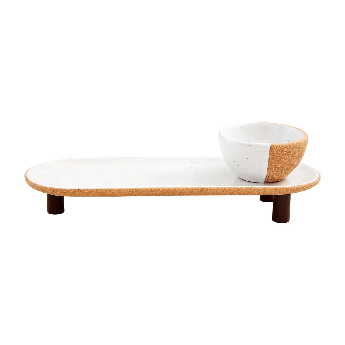 The White/Rust Tray & Dip Set features a two-piece combination of a glazed stoneware tray with sandy exposed texture and wooden feet, paired with a coordinating dip cup. This set offers a stylish and functional solution for serving appetizers with artisanal charm.